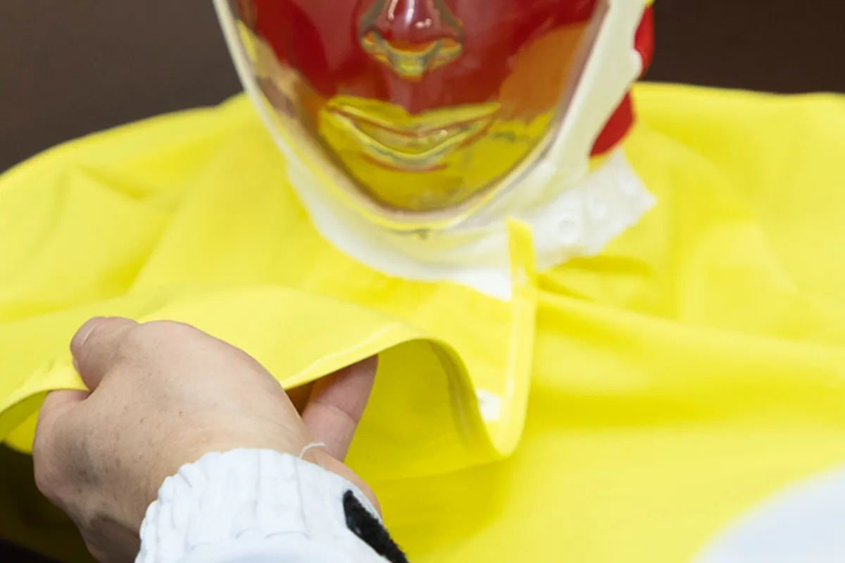 また展示会では首元をマジックテープで留めるタイプの製品を出していたんですが、先方は当社の「T6-21」のようにスナップボタンで留めるタイプが良いと言われたので「できます」とお伝えしました。