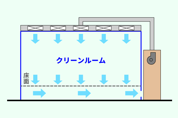 このフィルターを通して供給された清浄な空気が、天井や壁面から室内に流れ込み、床または壁の吸気口から排気されることで空気中の微粒子を効率的に捕捉・排除します。空気ががある一方向のみに流れるものを「一方向流(層流)」、そうでないものを「乱流」と呼びます。